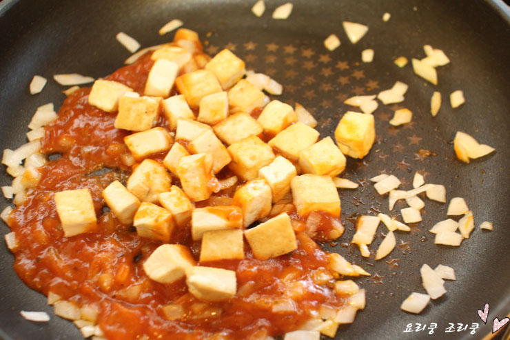 그리고는 따로 구워두었던 두부를 팬에 올려주어 소스를 고루 바르며 조려주세요