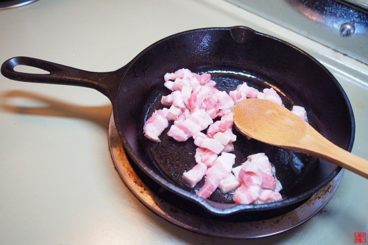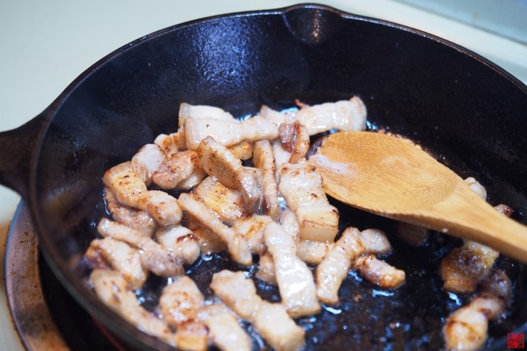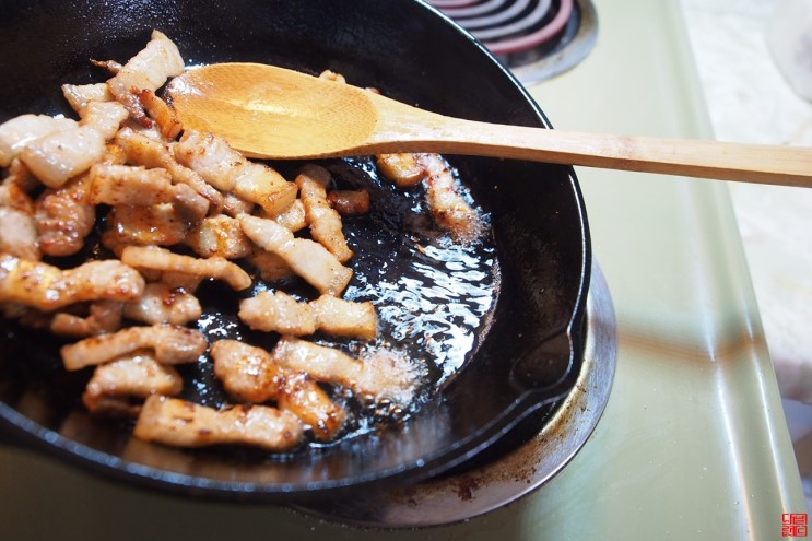 먼저 팬을 강불에서 3분간 예열 해 주시고 후추로 밑간 해 두었던 오겹살을 넣고 볶기 시작 해 주세요.