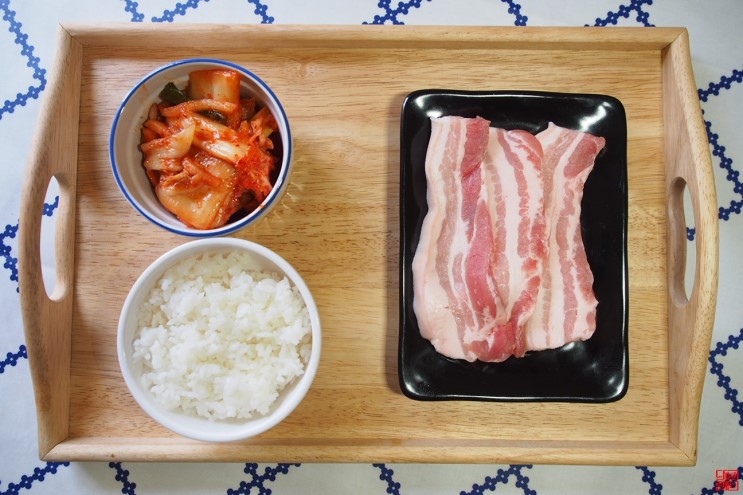 - 오겹살 200g, 묵은지 130g, 밥 1인분, 김슬라이스 3장