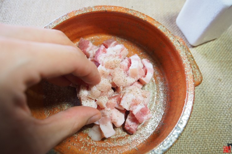 오겹살은 1.5cm 간격으로 잘라 후추1/3 작은 술과 소금1/2 작은 술로 밑간 해서 준비해 주세요.