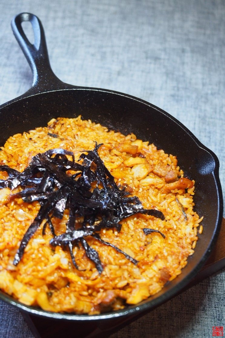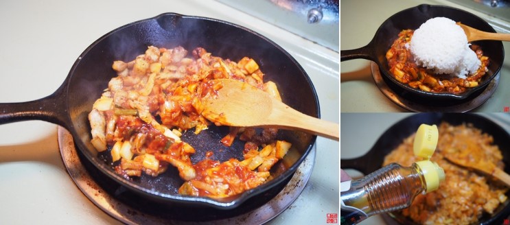 준비해 둔 양념 김치와 밥을 넣고 재빨리 볶아주신다음 마지막 마무리는 참기름1 작은 술을 넣고 한번 가볍게 볶아주시는 걸로 완성해 주시면 됩니다.